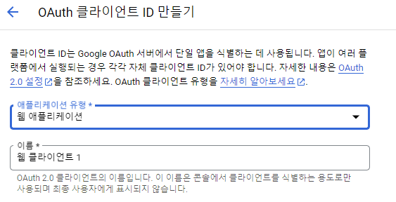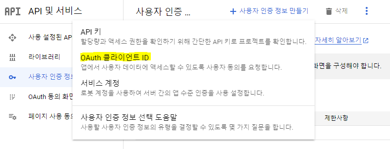 [API 및 서비스] > [사용자 인증 정보] > [사용자 인증 정보 만들기] > [OAuth 클라이언트 ID 만들기]