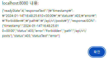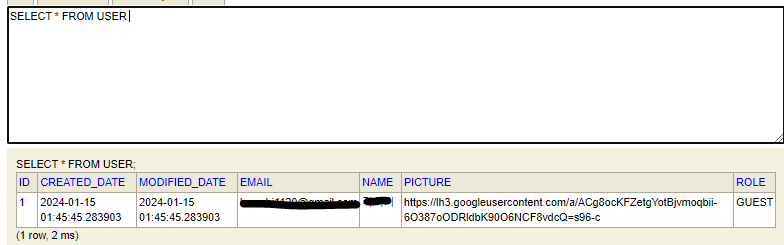 위와 같이 403(권한 거부) 에러가 발생한다. h2-console로 가서 사용자의 role을 USER로 변경하여 권한 변경을 한다.
