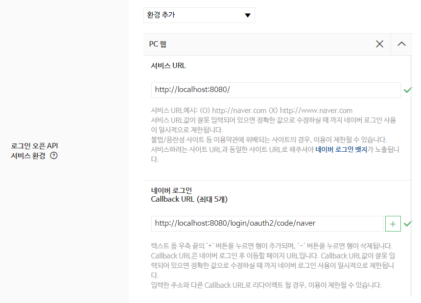 서비스 URL은 필수이다. localhost:8080으로 등록한다. 또한 Callback URL은 구글에서 등록한 리디렉션 URL과 같은 역할을 한다. /local/oauth2/code/naver로 등록한다.