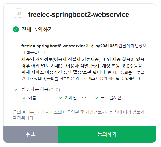 - 네이버 로그인 URI는 application-oauth.properties에 등록한 redirect-uri 값에 맞춰 자동으로 등록된다.