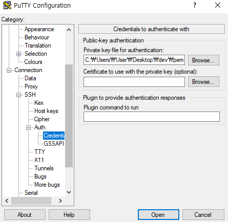 Connection > Auth > Credentials > Private key file to authentication Browse 로드