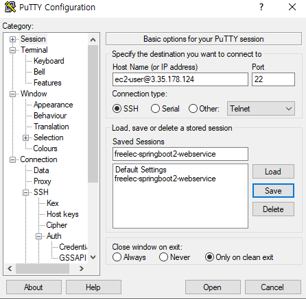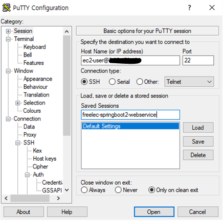 Session에서 HostName, Port, Connection Type을 지정해준다.