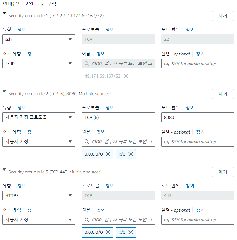 - 지정된 IP에서만 ssh 접속이 가능하게 구성하고, 다른 장소에서 접속할 때는 해당 장소의 IP를 다시 SSH 규칙에 추가하는 것이 안전