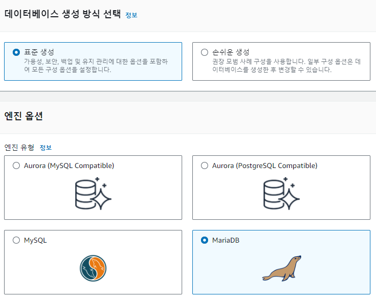 검색창 RDS 입력 > 대시보드에서 [데이터베이스 생성]