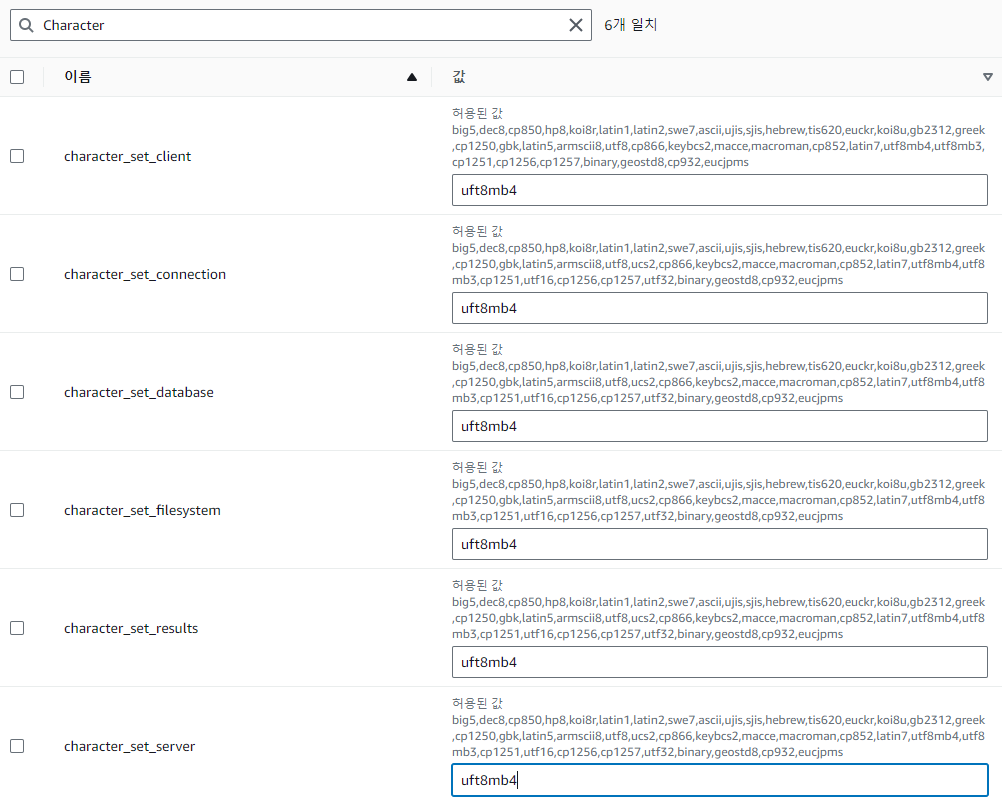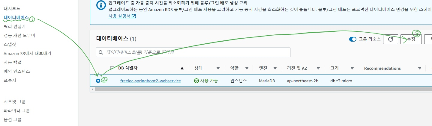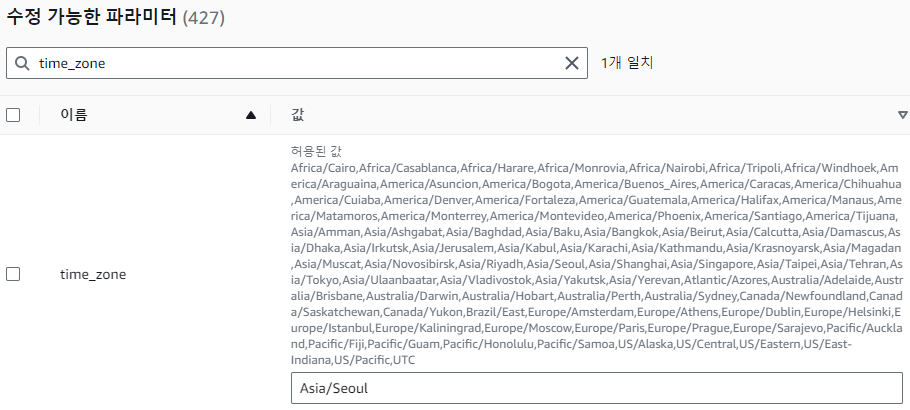 DB 파라미터 그룹을 방금 생성한 신규 파라미터 그룹으로 변경 > 저장