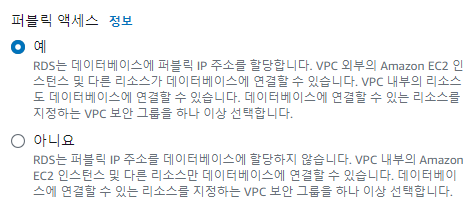 퍼블릭 액세스를 예로 바꾼다. 이후 보안 그룹에서 지정된 IP만 접근하도록 막을 예정